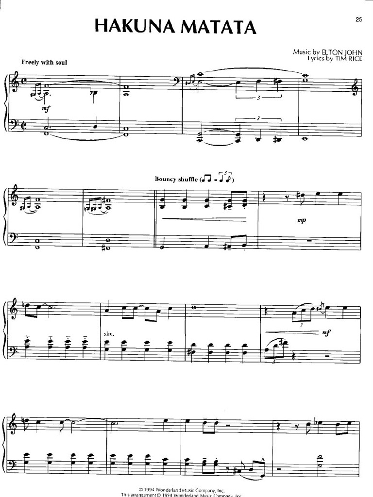 Elton John Hakuna Matata Sheet Music Piano Solo In C Major Download Print Sku Mn0095315