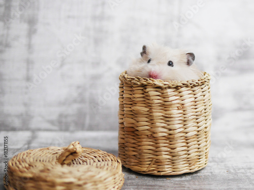 A Cute Fluffy Hamster Looks Out Of A Wicker Basket Gray Bleached Background Funny Animals Greeting Card With An Animal Buy This Stock Photo And Explore Similar Images At Adobe Stock
