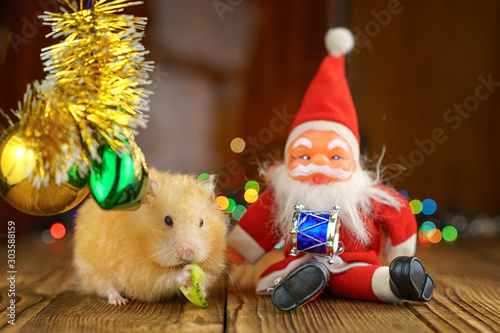 Cute Fluffy Hamster And Santa Claus On Wooden Background Bright Bokeh Festive Atmosphere Buy This Stock Photo And Explore Similar Images At Adobe Stock Adobe Stock