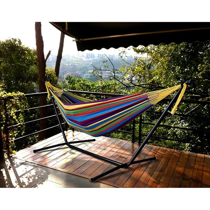 Hammock With Stand Patio Garden Camping Black Steel Frame Stripe Portable Bed Devinebestbuys Conte Hammock Stand Backyard Patio Furniture Swing Chair Outdoor