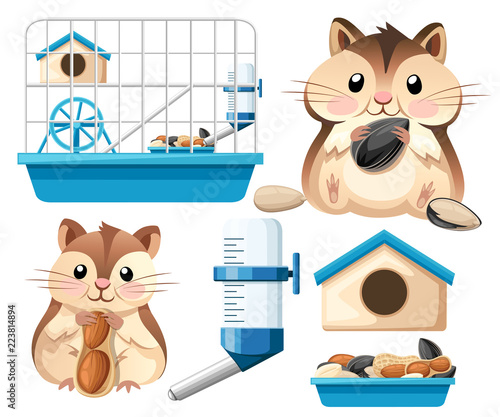 Hamster Icon Collection Cute Hamster Sit And Holding A Sunflower Seed And Nut Hamster Cage Wheel And Automatic Drinker Cartoon Character Design Flat Vector Illustration On White Background Buy This Stock
