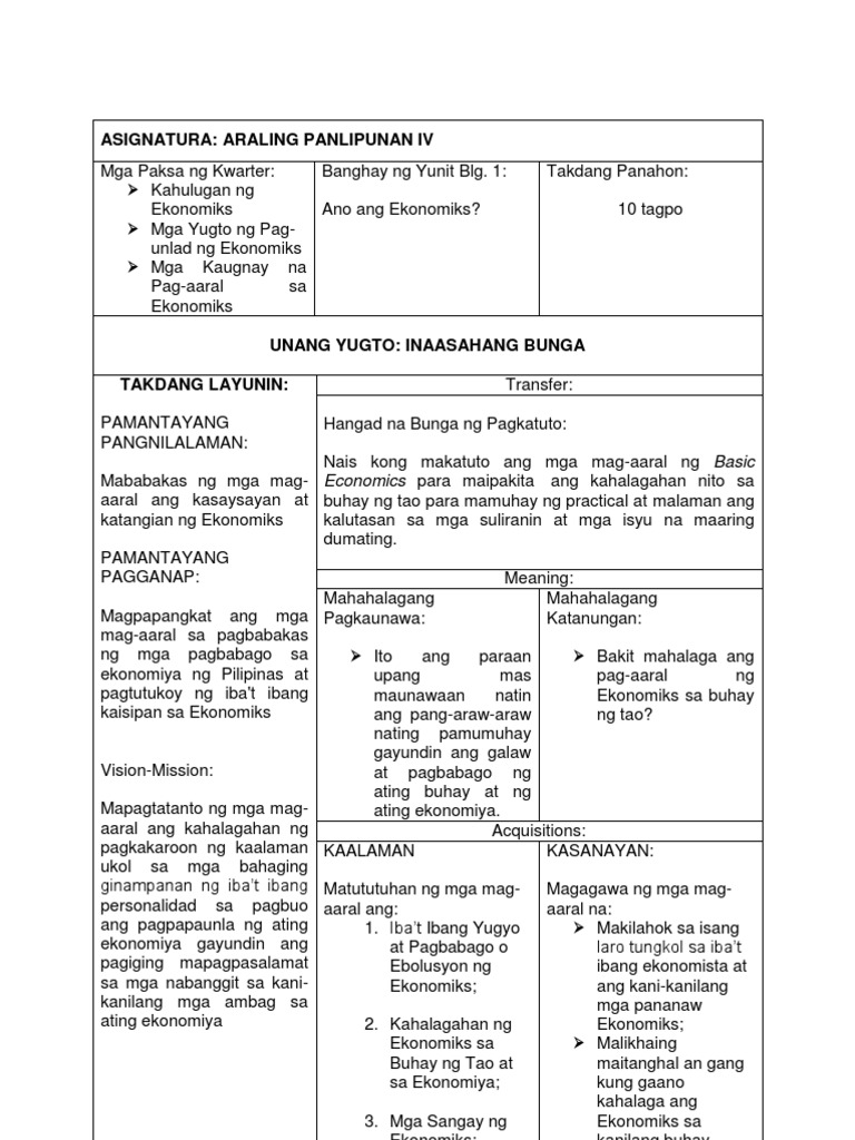 Pdf Sample Learning Plan In Araling Panlipunan 9 Ekonomiks Quarter 1 Krismae Fatima De Castro Academia Edu