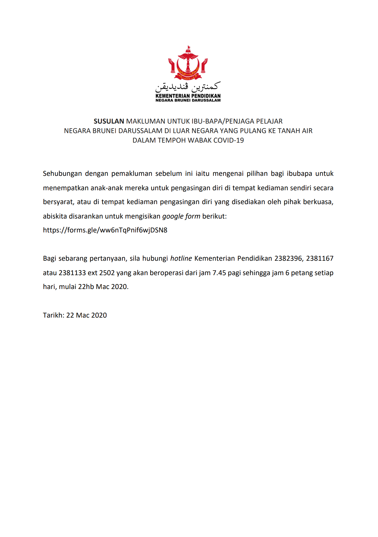 Surat Pemberitahuan Kementerian Pendidikan Negara Negara Brunei Darussalam Ke Luar Tawaran Pdf Document