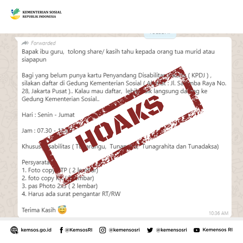 Kementerian Sosial Ri V Twitter Telah Beredar Pesan Berantai Melalui Whatsapp Berisi Informasi Terkait Pendaftaran Penerima Kartu Penyandang Disabilitas Jakarta Kpdj Ke Kantor Kemensos Jln Salemba Raya No 28 Jakarta Pusat Informasi