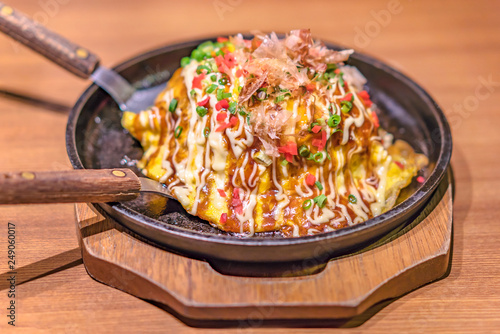 Japanese Okonomiyaki Covered With Katsuobushi Leek Mayonnaise And Bulldog Sauce Served On A Hot Plate With Spatulas Stock Photo Alamy