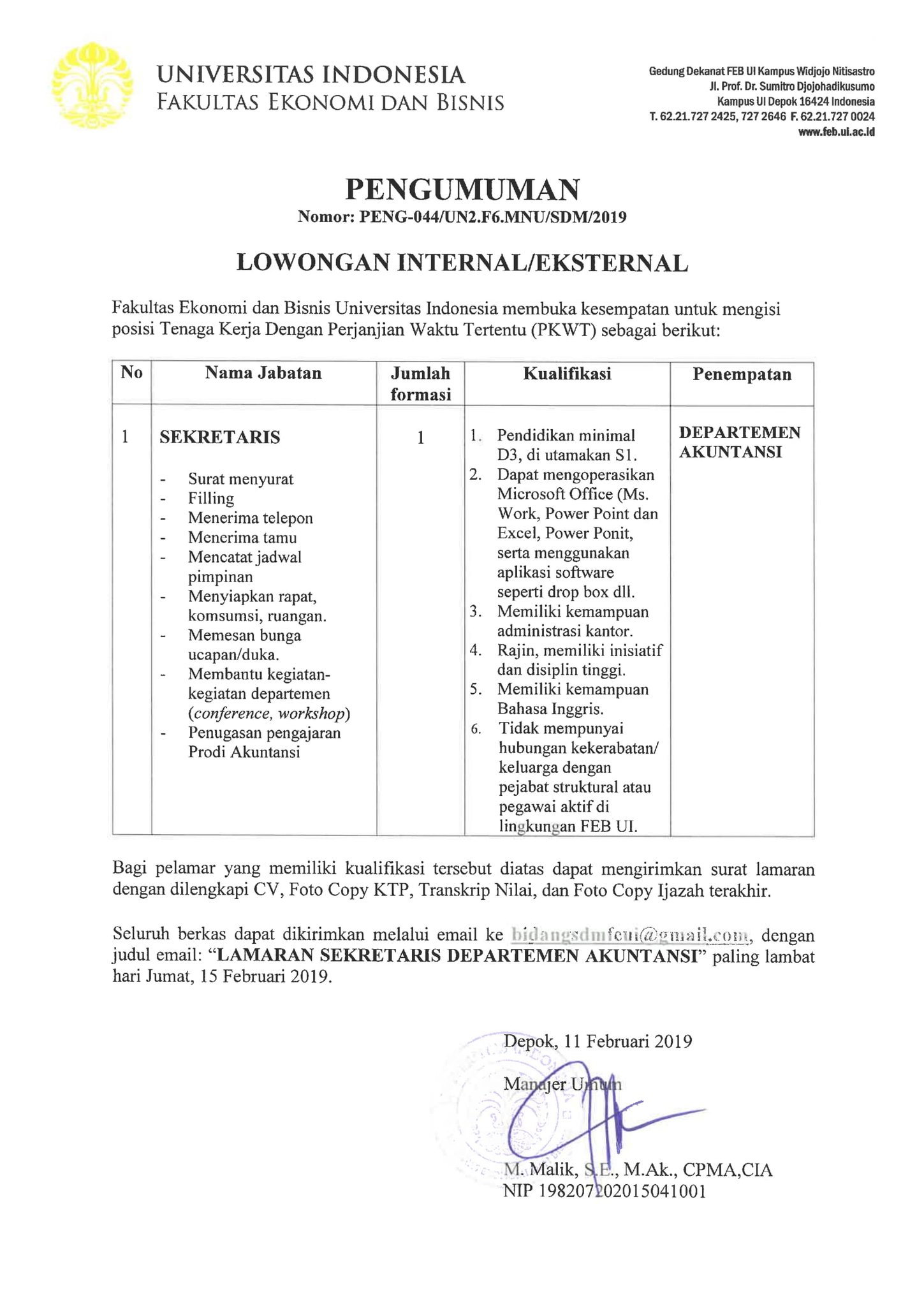 Cdc Ventura Kerjasama Alumni Feb Ui در توییتر Lowongankerja Sekretaris Staf Administrasi Jurnal Di Feb Ui Seluruh Berkas Dapat Dikirimkan Melalui Email Ke Bidangsdmfeui Gmail Com Dengan Judul Email Lamaran Pkwt Sekretaris