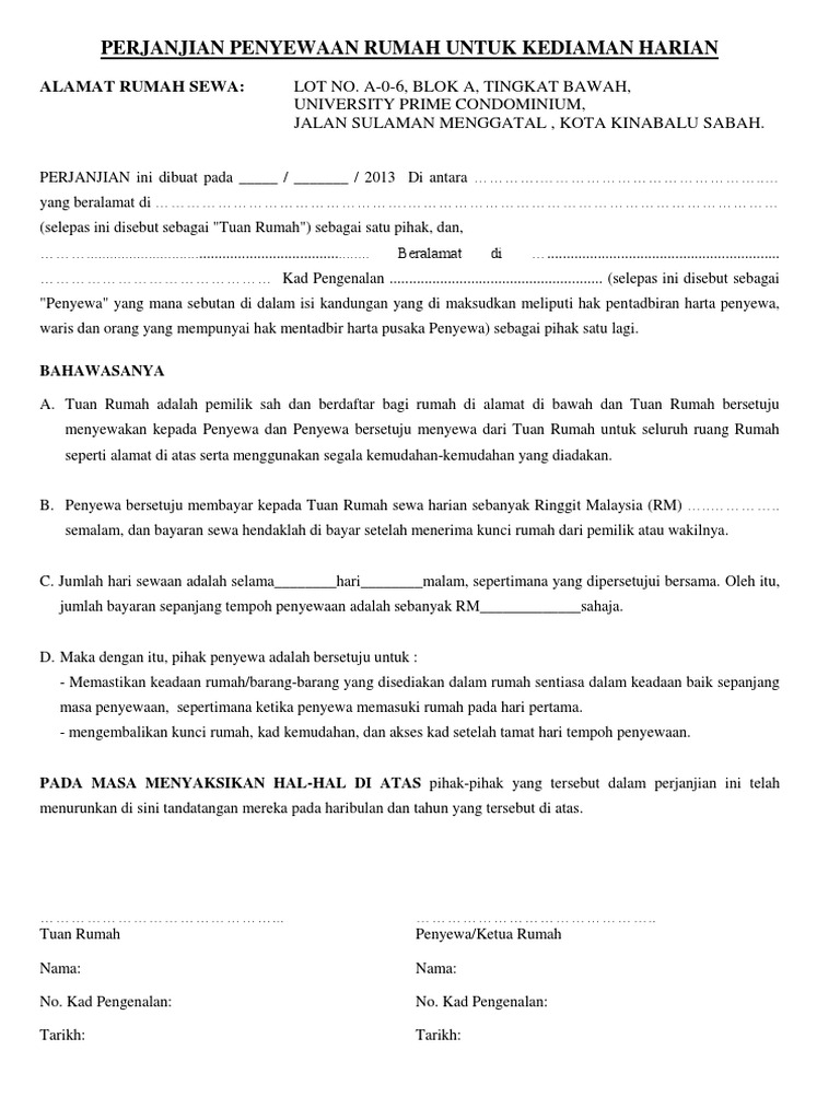 Contoh Surat Perjanjian Sewa Rumah 2020 Download Doc Portal Malaysia