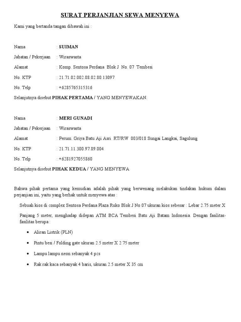 Contoh Surat Perjanjian Sewa Rumah Ruko Kios Surat